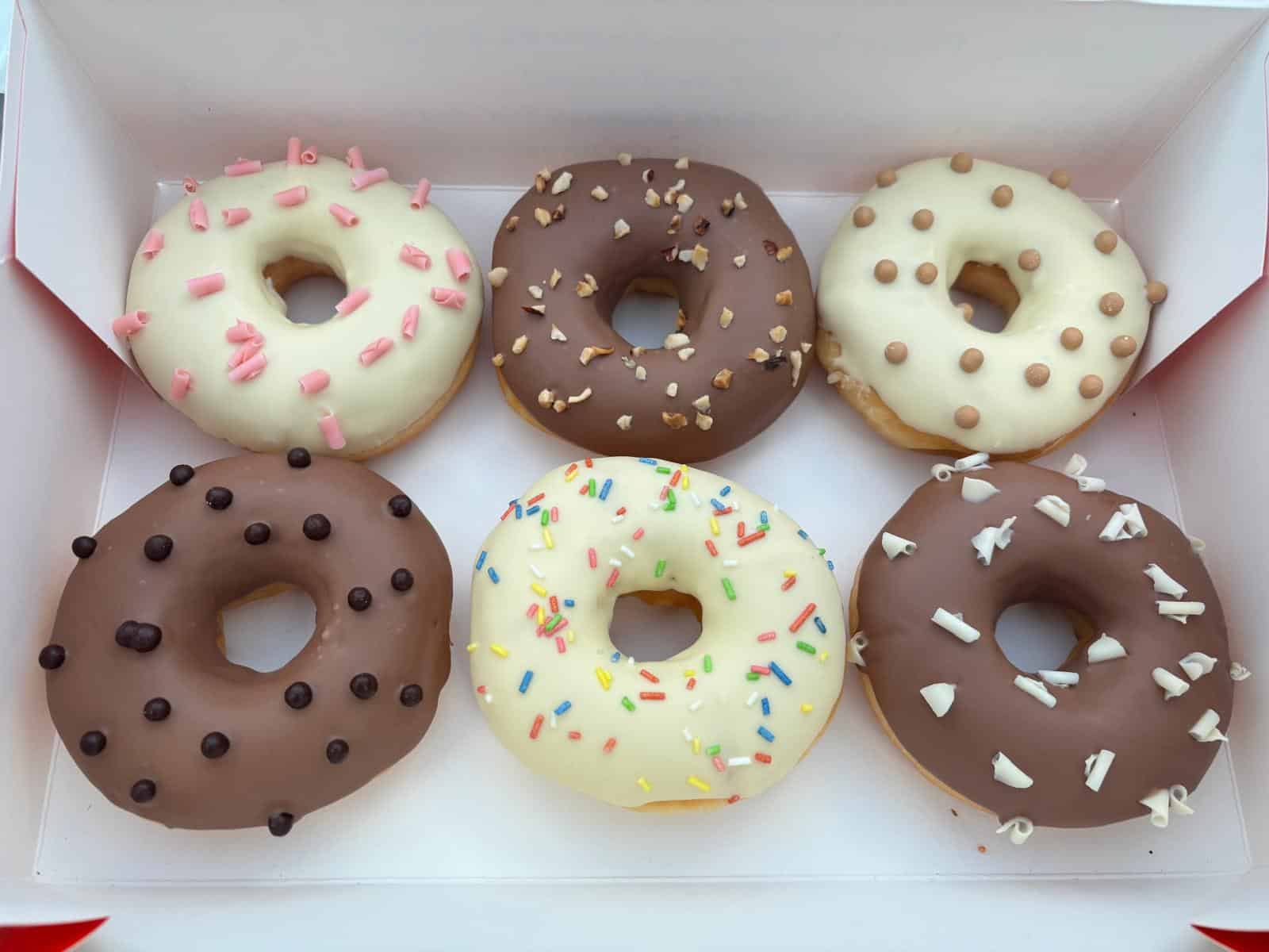 In dieser gemischten Box erwartet dich eine köstliche Auswahl an Donuts mit feinen Schokoglasuren, bunten Streuseln und optional mit cremigen Füllungen – perfekt, um die Vielfalt zu genießen.