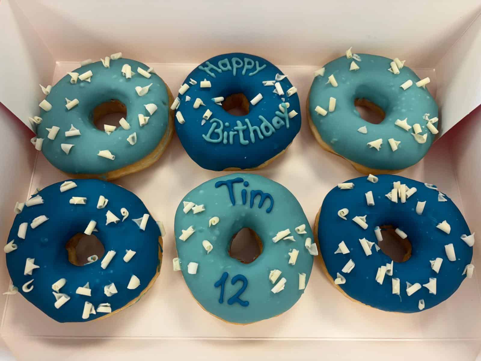 Happy Birthday Donuts – Blau mit weißen Schokoflocken